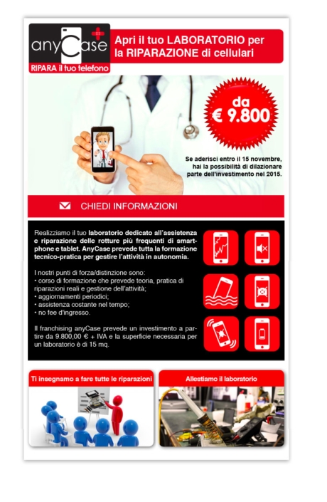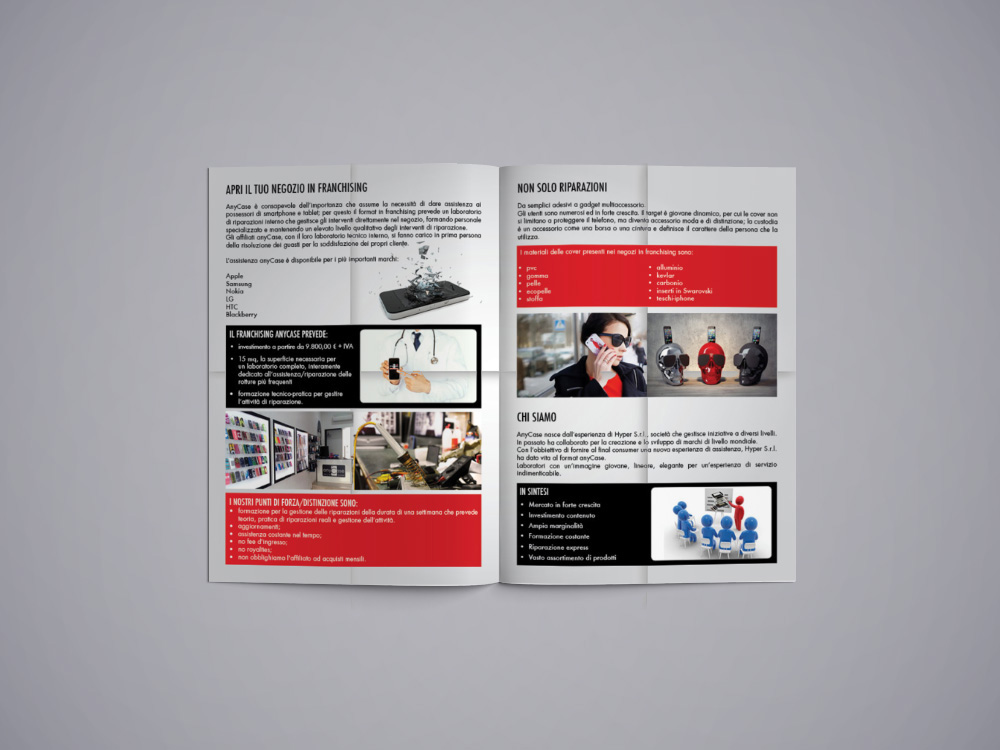 Ho seguito la progettazione grafica del marchio Anycase, franchising in riparazioni di telefoni cellulari.